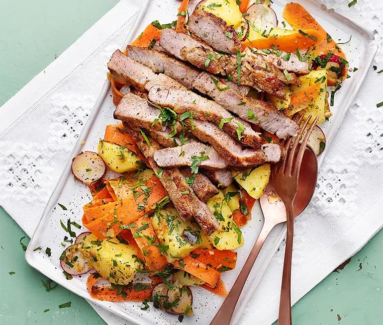 Kryddstekt fläskkarré med kokta grönsaker och gräddsås