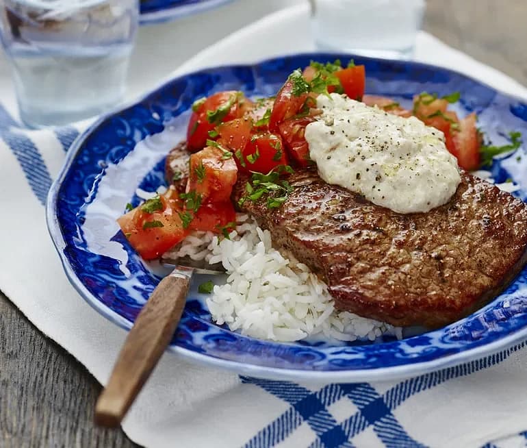 Kryddstekt hällefilé med aubergine och tzatsiki