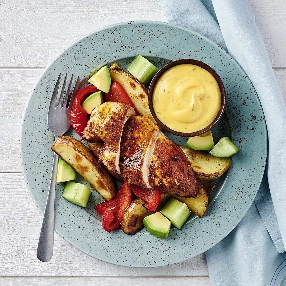 Kryddstekt kyckling med sötpotatis och avokadoröra
