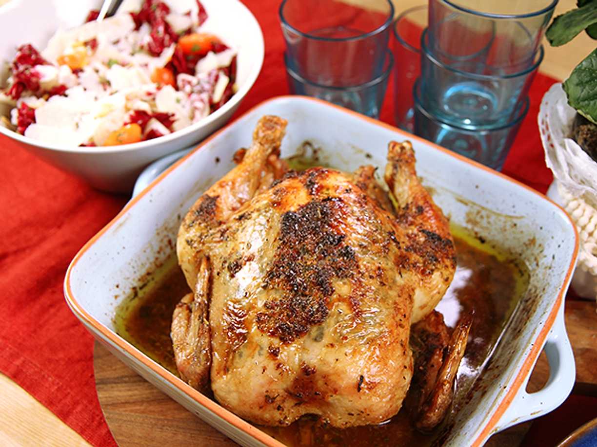 Hel kyckling med dragonsmör och ugnsrostade rotfrukter