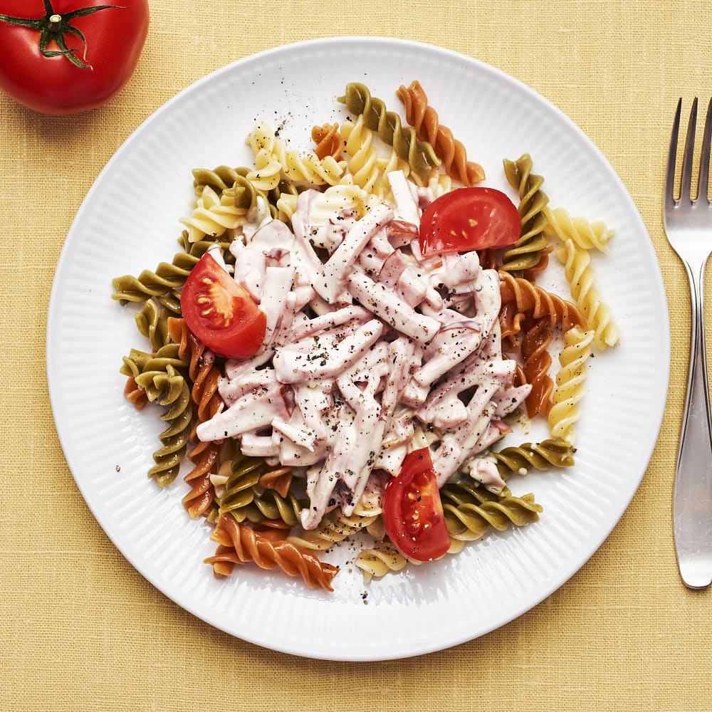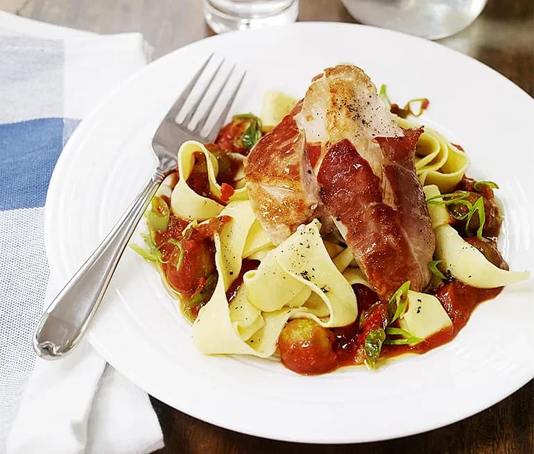 Måndagspasta med tomat, parmaskinka och kyckling
