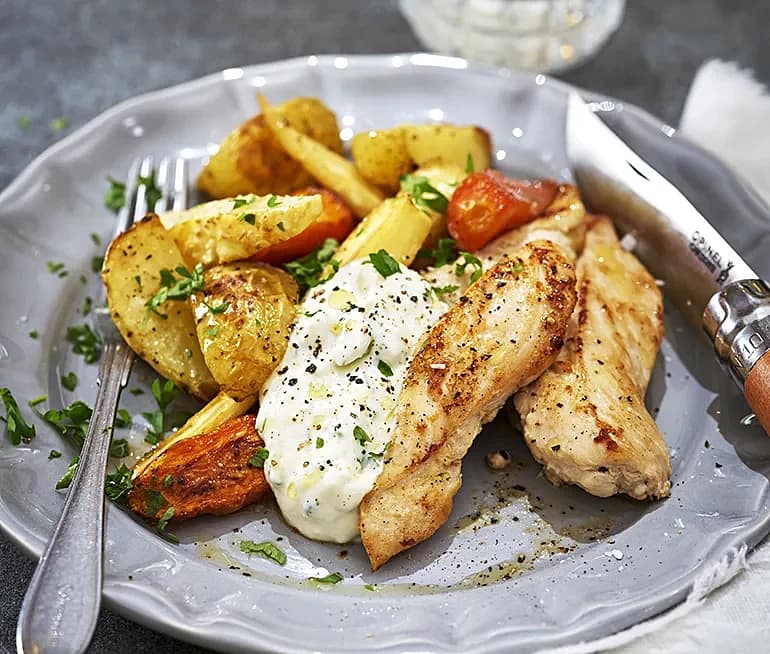 Kyckling med klyftpotatis och basilikakräm