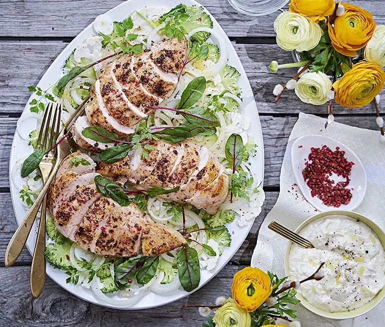 Rosépepparstekt kyckling med blomkåls- och broccolisallad