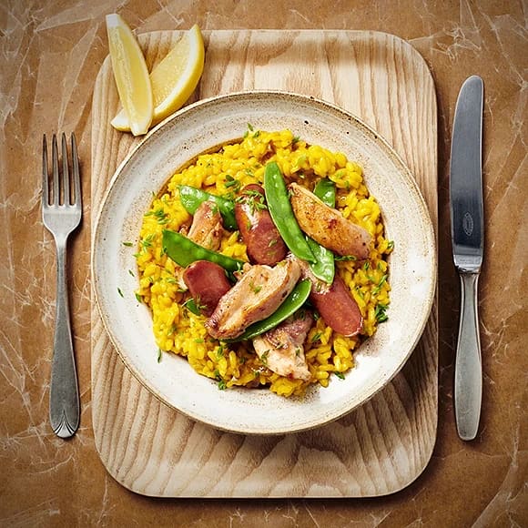 Paella med kyckling och sockerärtor