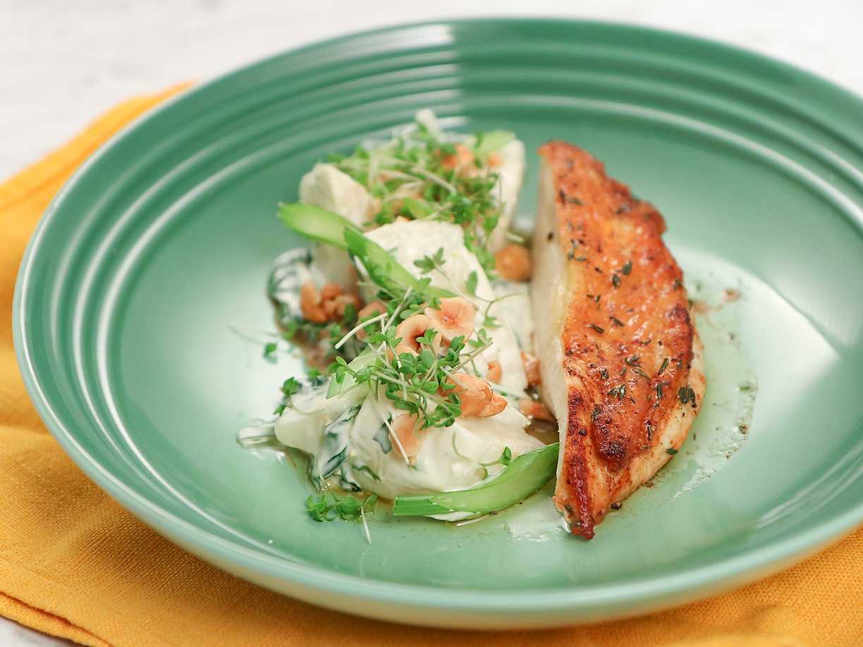 Stekt kyckling med lättstuvad rotselleri och saltrostade hasselnötter