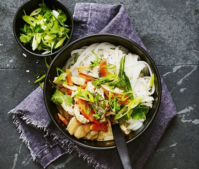 Kyckling och ingefära i buljong med nudlar och champinjoner