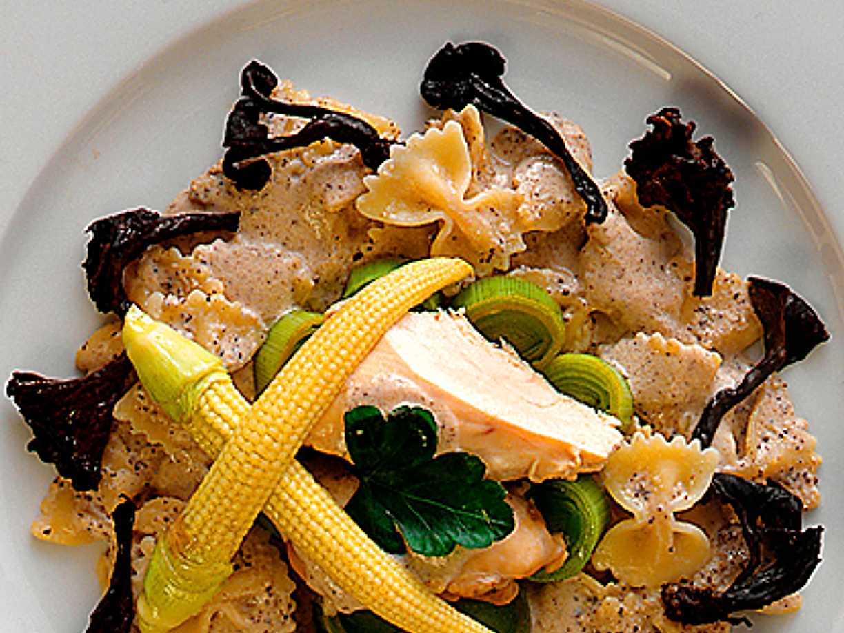 Fjärilspasta med kyckling och svart trumpetsvamp