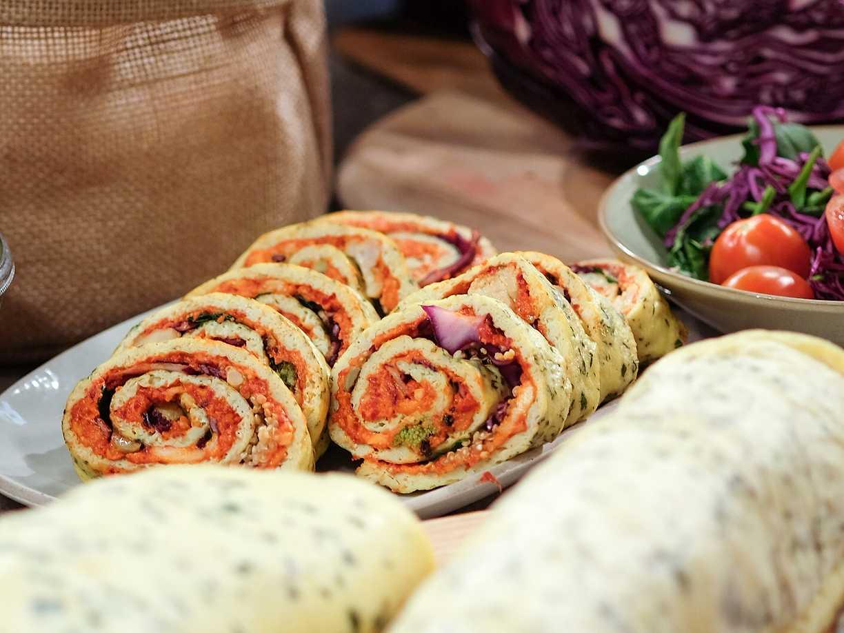 Omelettrulle med hummus och paprikamarinerad kyckling