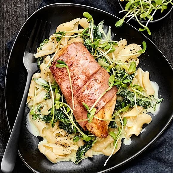 Baconlindad kyckling med stuvad spenat