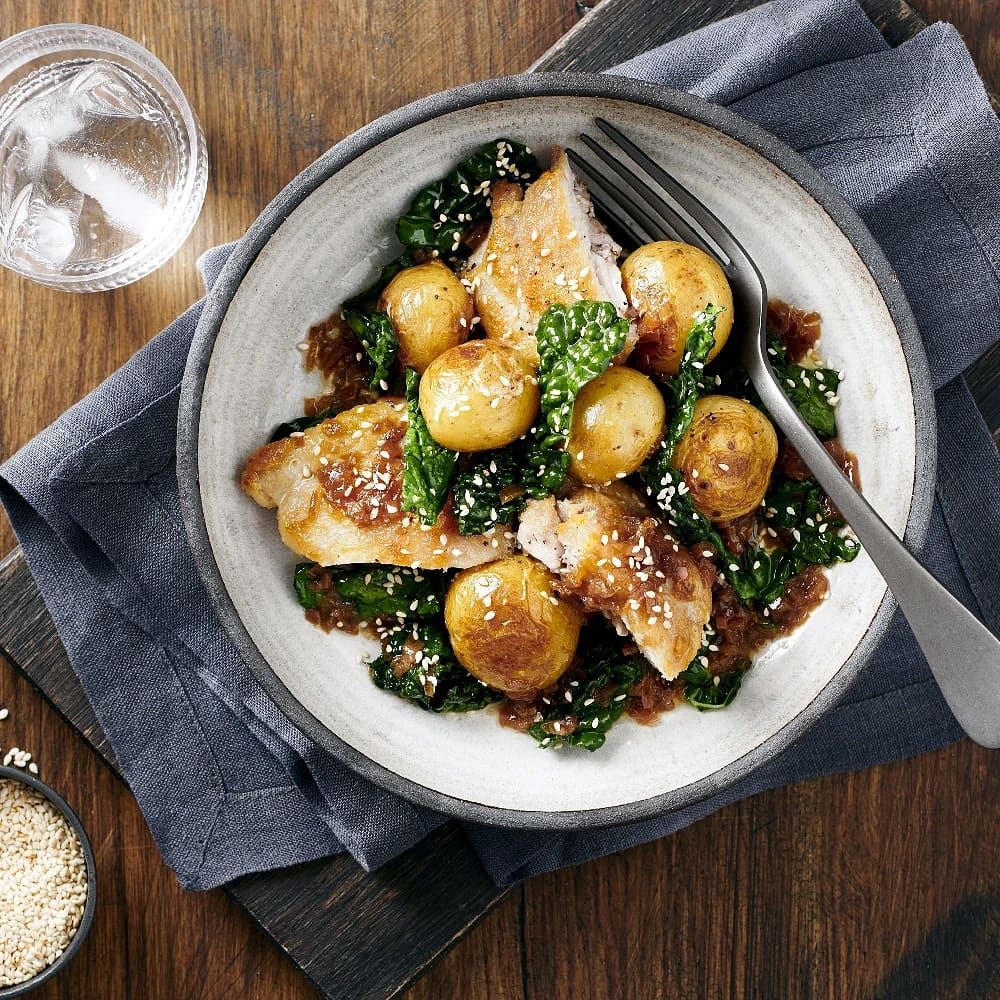 Kyckling med brysselkål, apelsinsås och gratäng