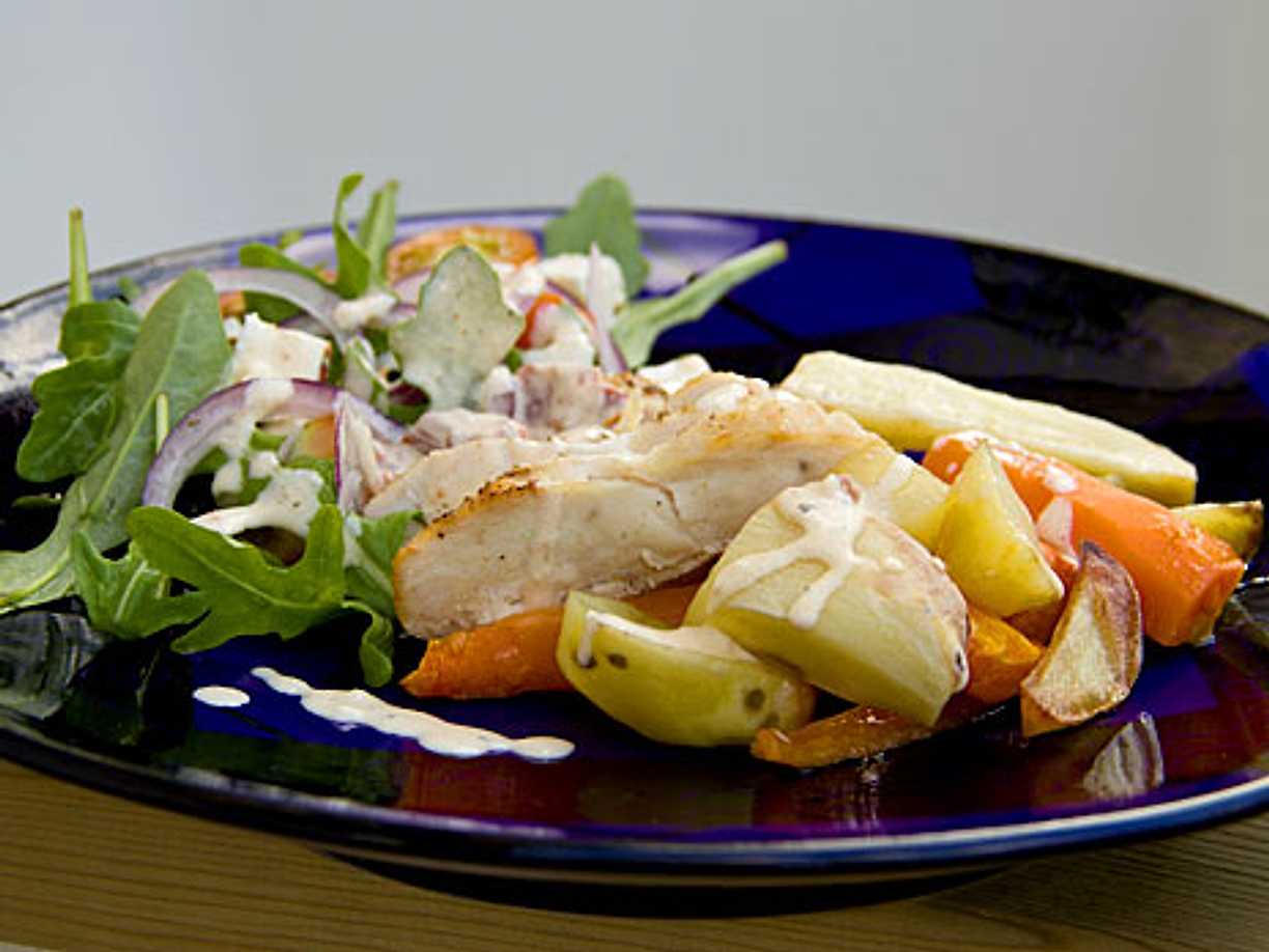 Stekt kyckling med rostad sötpotatis och tzatziki