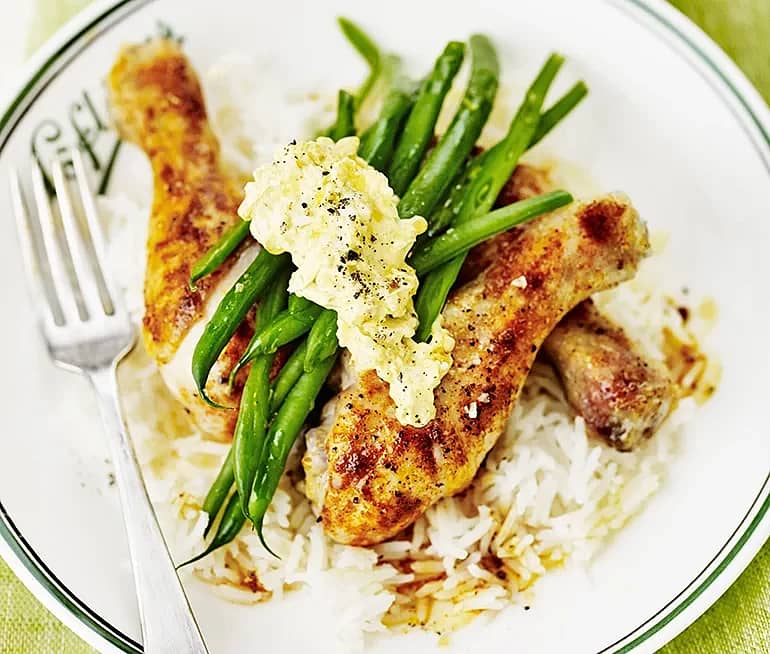 Kycklingben med kryddris och citronyoghurt