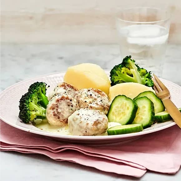 Kycklingbullar i gräddsås med pasta och majs