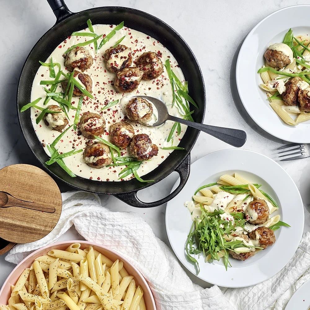 Pasta med kycklingbullar i krämig pepparsås