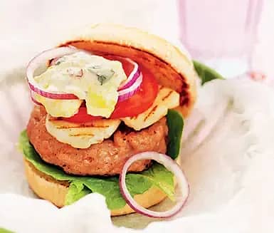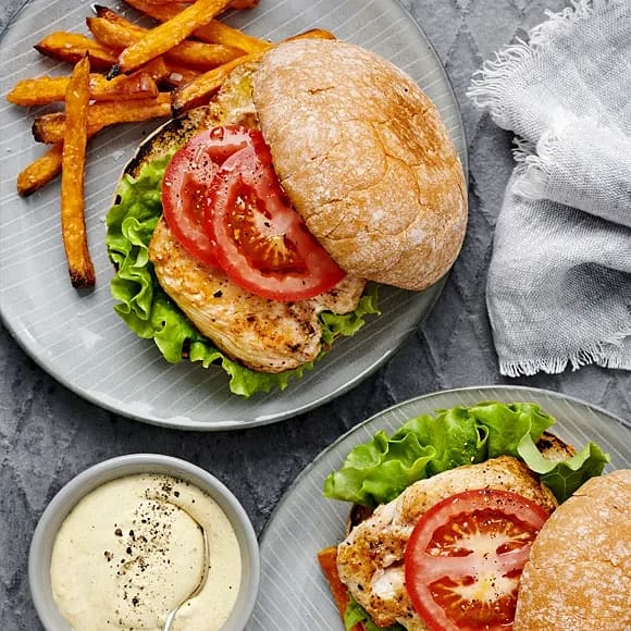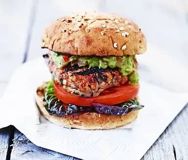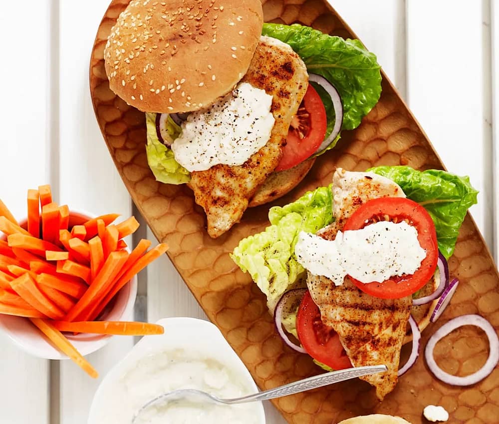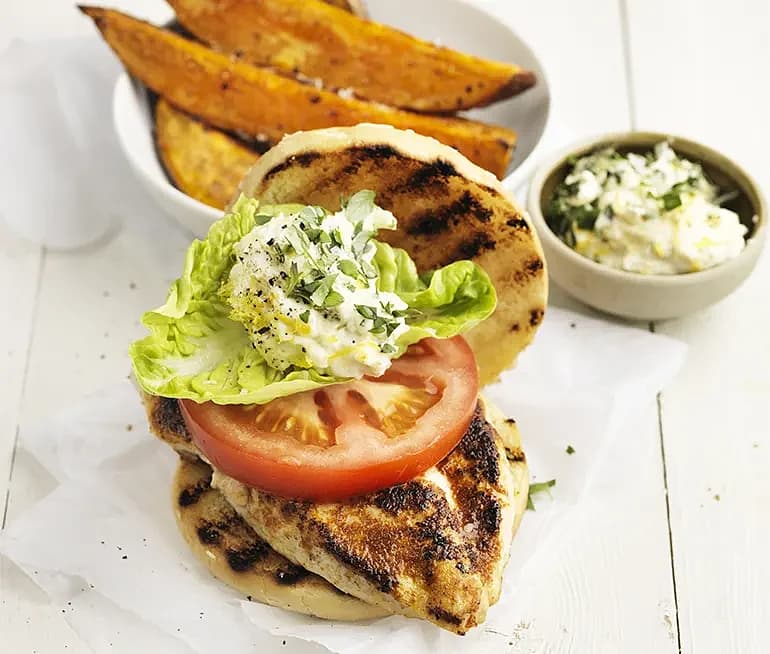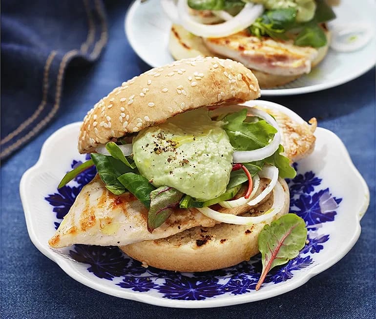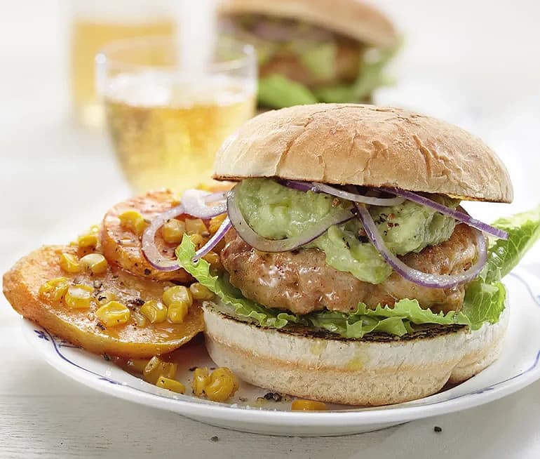 Kycklingburgare med avokadoyoghurt och grillad mango