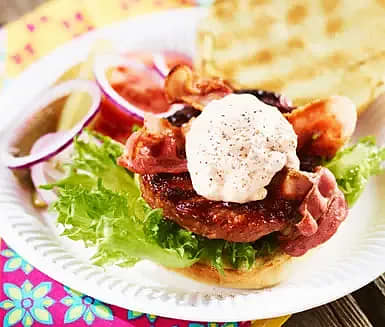 Kycklingburgare med sötpotatisfrittes och picklad lök