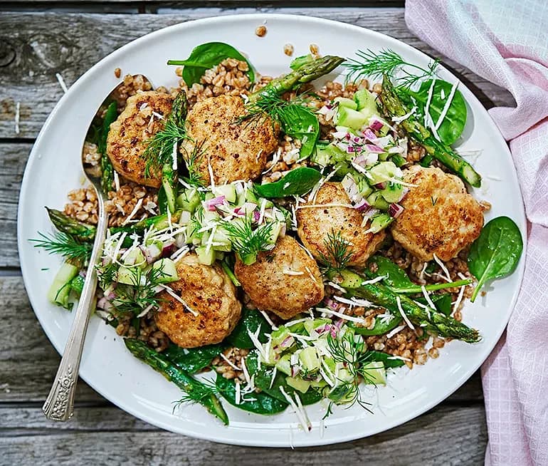 Kycklingfärsbiffar med gurksalsa och sparris