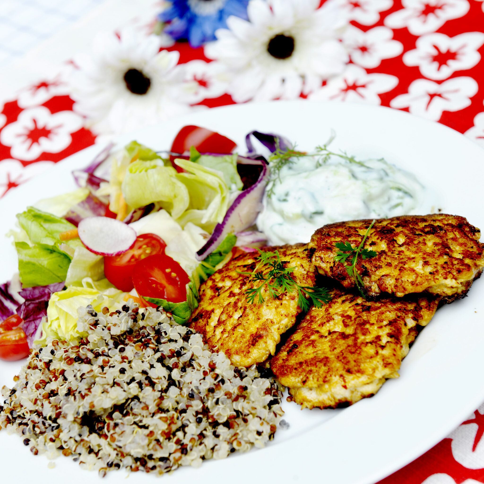 Kryddiga kycklingfärsbiffar med spenatyoghurt