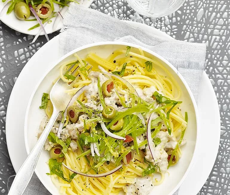 Citron- och kycklingfärssås med spaghetti