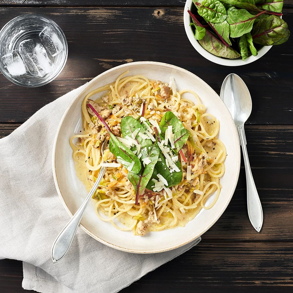 Kycklingfärssås med svampcrème fraiche och spaghetti