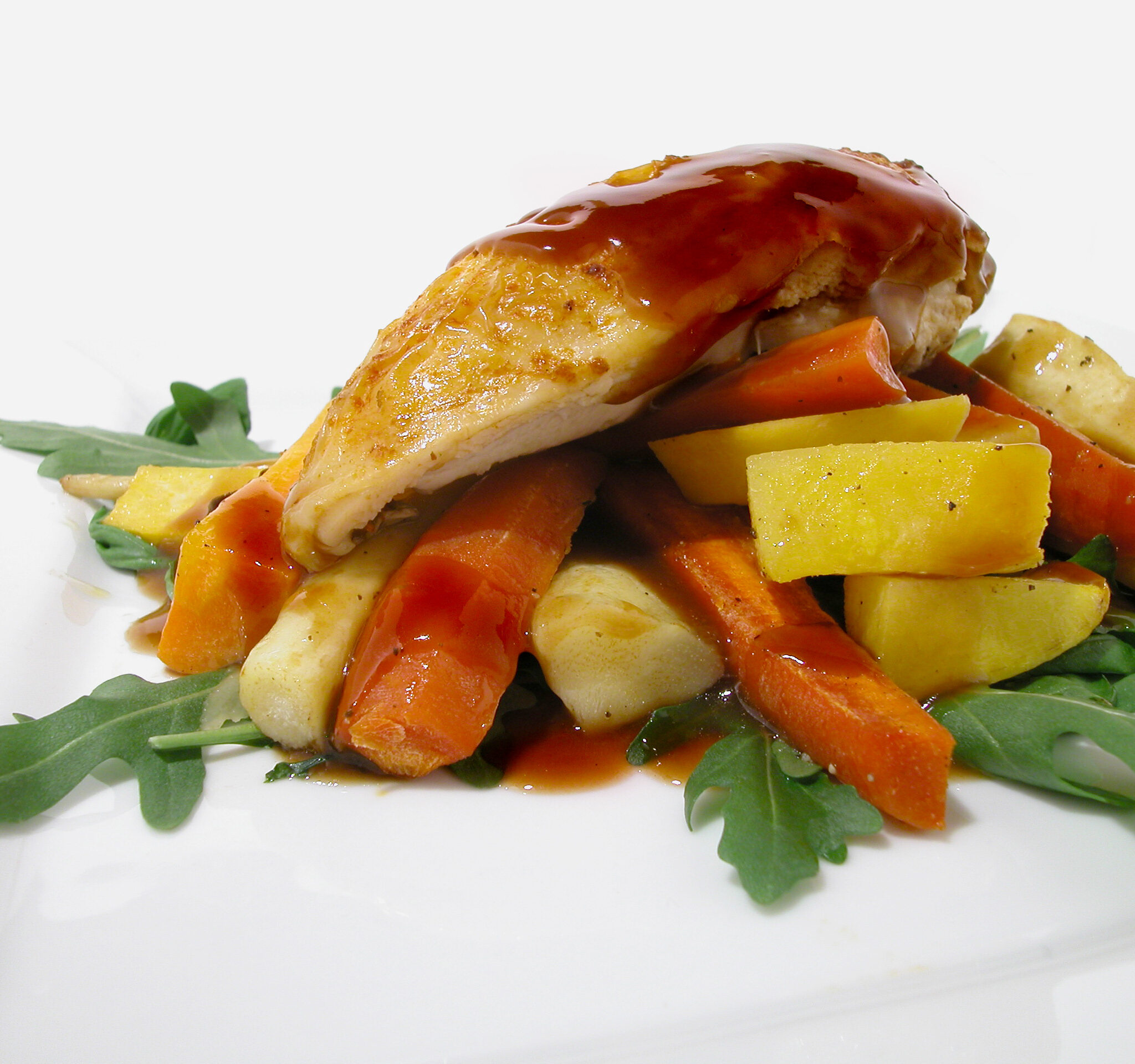 Stekt kycklingfilé med vitlöksdoftande rotfrukter och rödvinsås