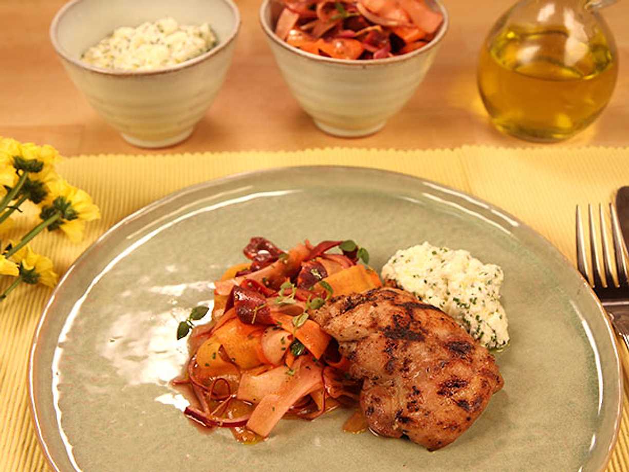 Gotländsk morotssallad med grillad kycklingfilé och fåroströra