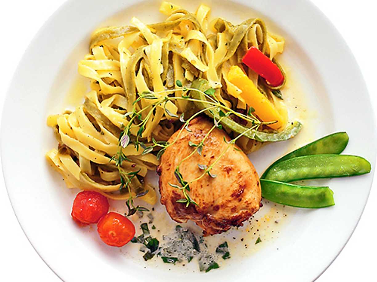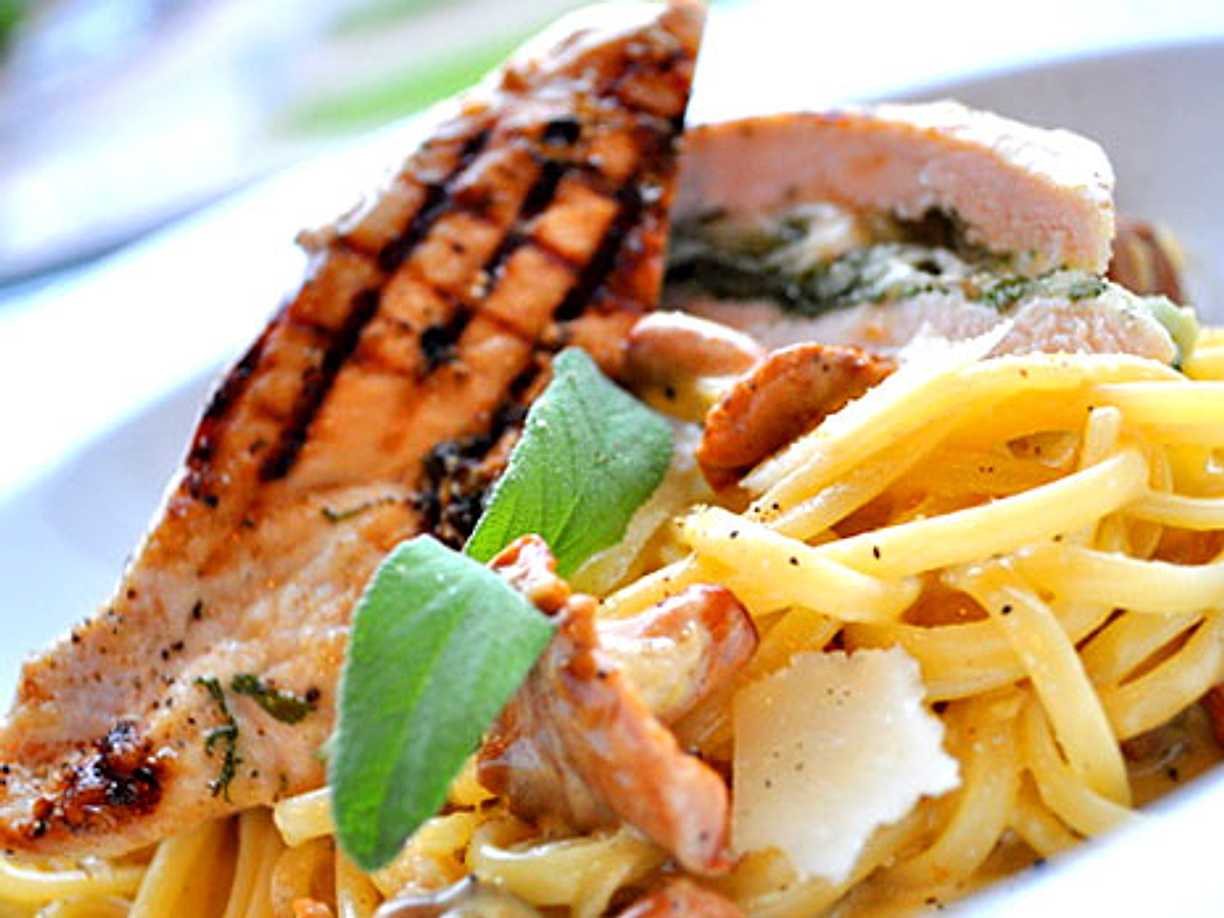 Pestofylld kycklingfilé med smörfrästa grönsaker