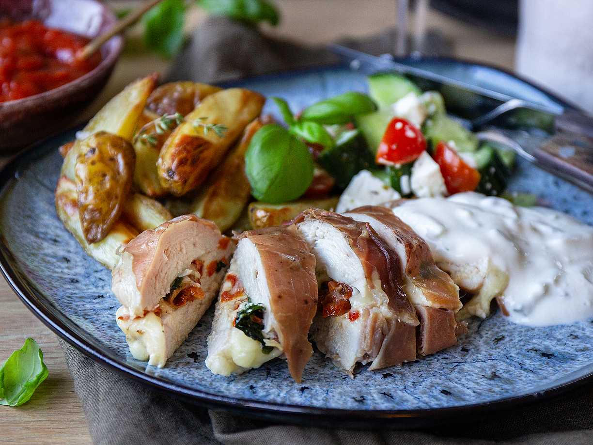 Kycklingfilé med kesella, feta och tomatfyllning, serverad på en rosmarinkryddad potatisbädd med mango och kiwisallad och en skummig grön sky