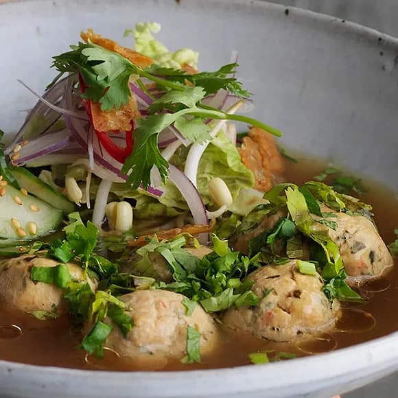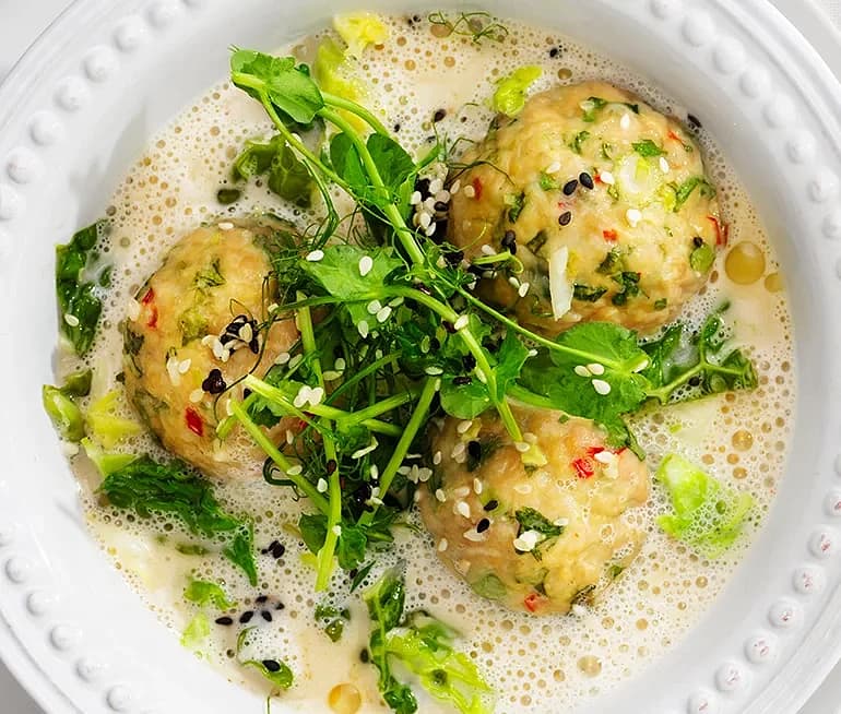Kycklingbuljong med citrongräs, soja och kycklingfrikadeller