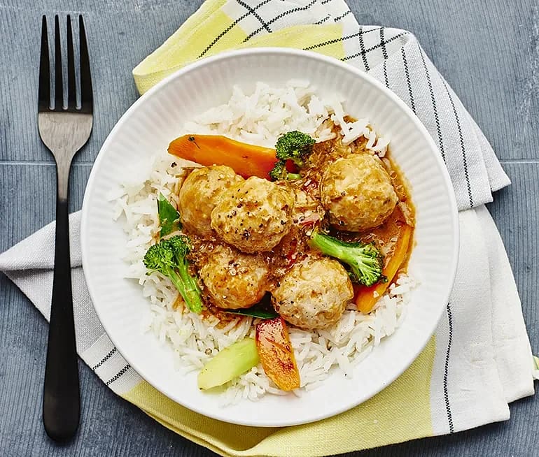 Kycklingfrikadeller i tomatsås med ris