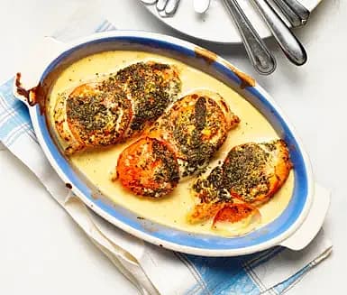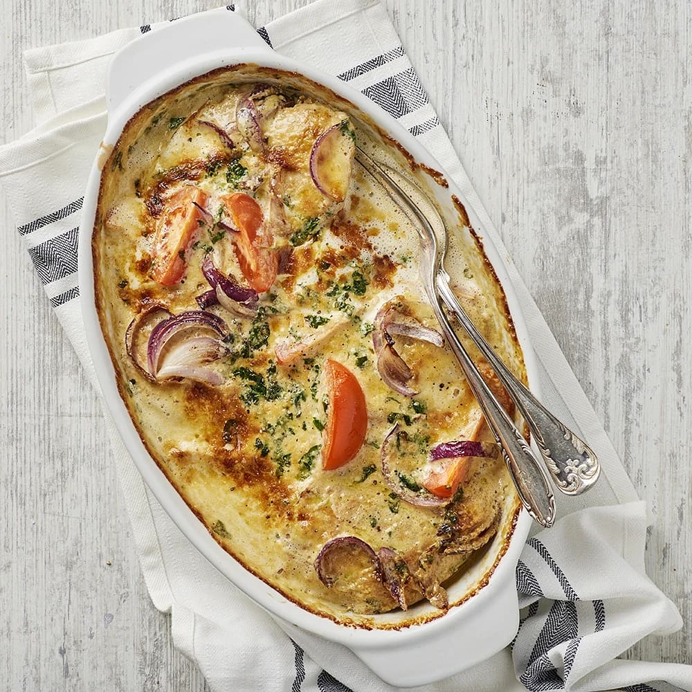 Kycklinggratäng med dijonsenap, soltorkad tomat och basilika