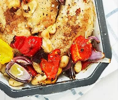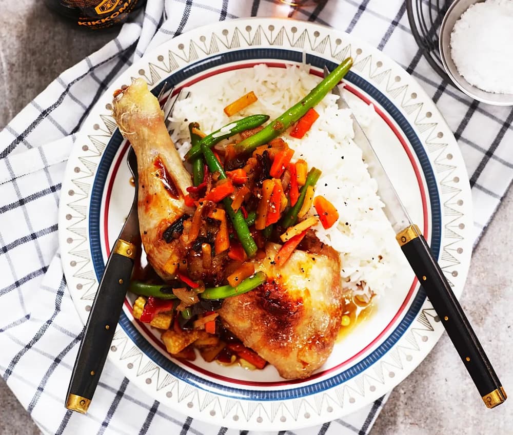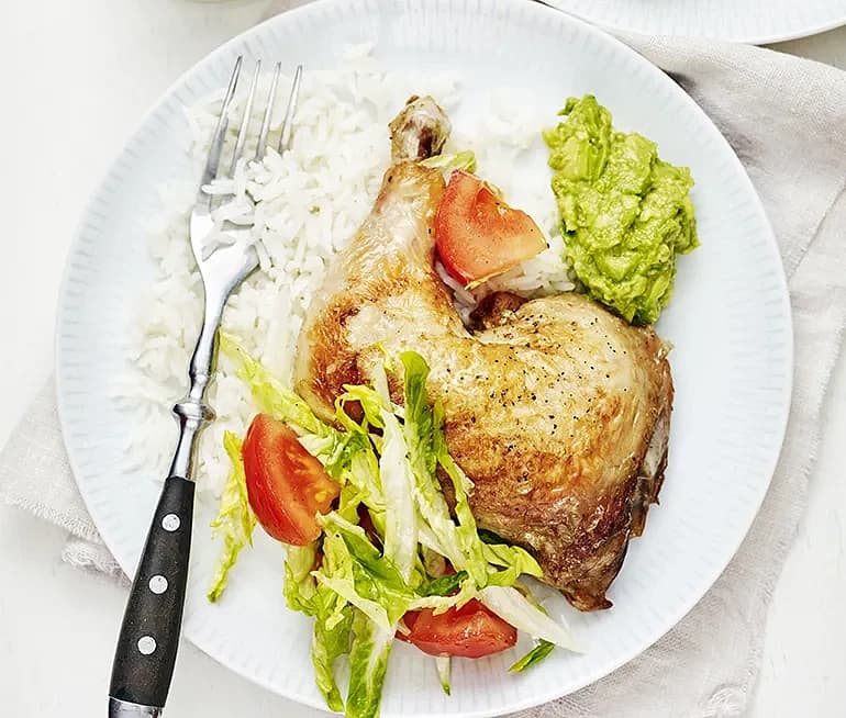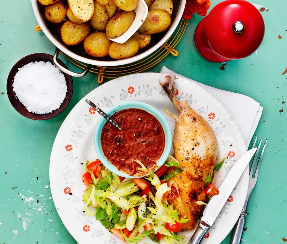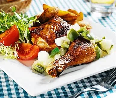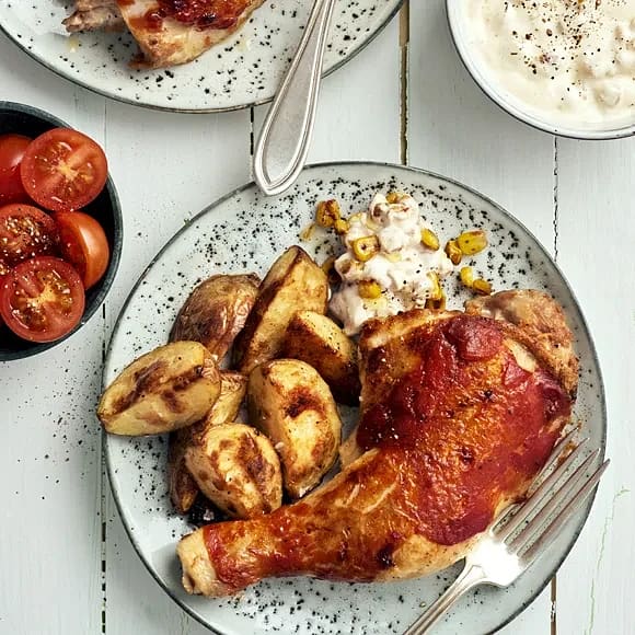Kycklingklubba med potatisklyftor, äpple och tomat