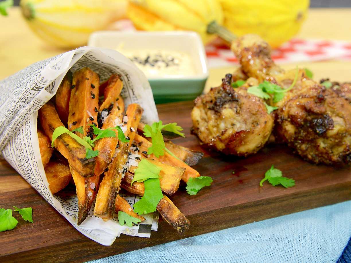 Heta kycklingklubbor med dippsås och sötpotatispommes