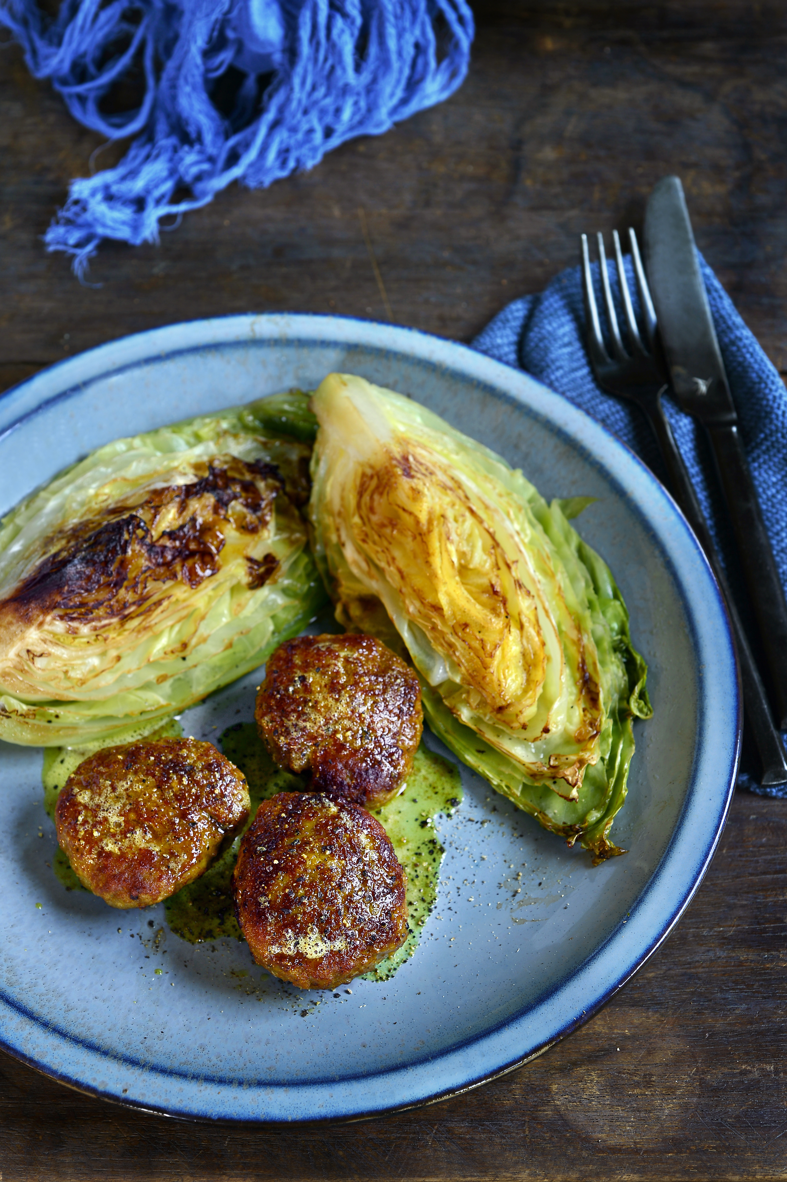 Kycklingköttbullar med stekt spetskål