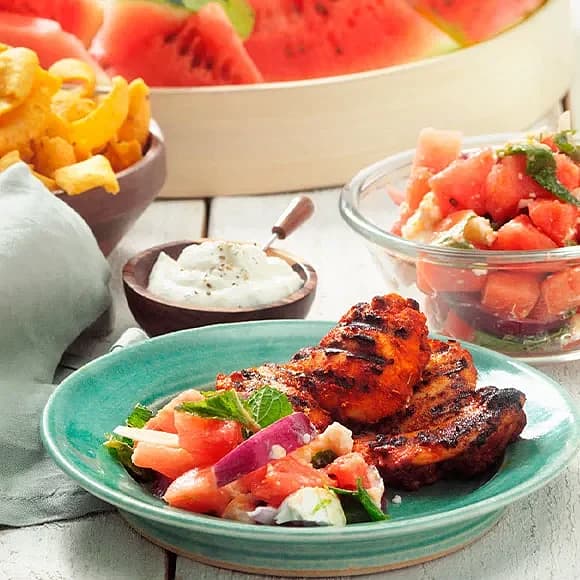 Grillad kycklinglårfilé med melonsallad och yoghurtsås
