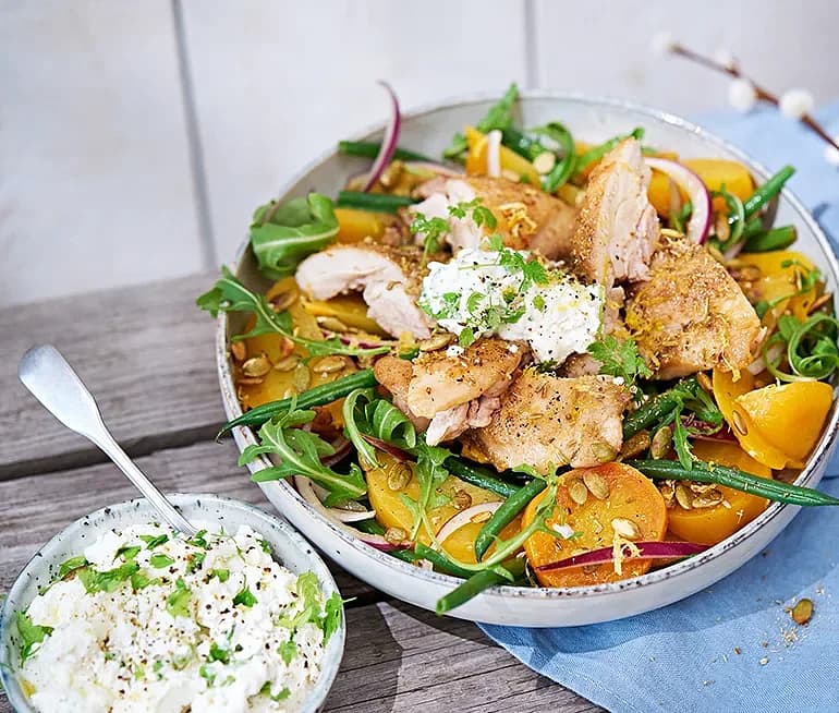 Kycklinglårfilé med vaxbönor och tahiniyoghurt