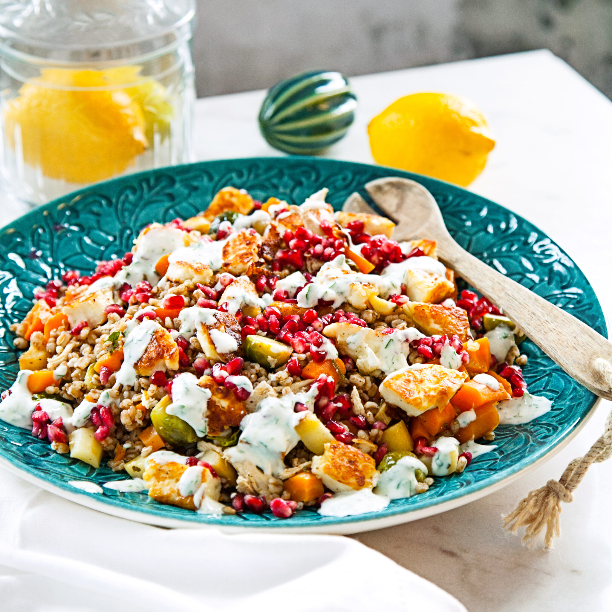 Sandras ljumna kycklingsallad med halloumi och granatäpple