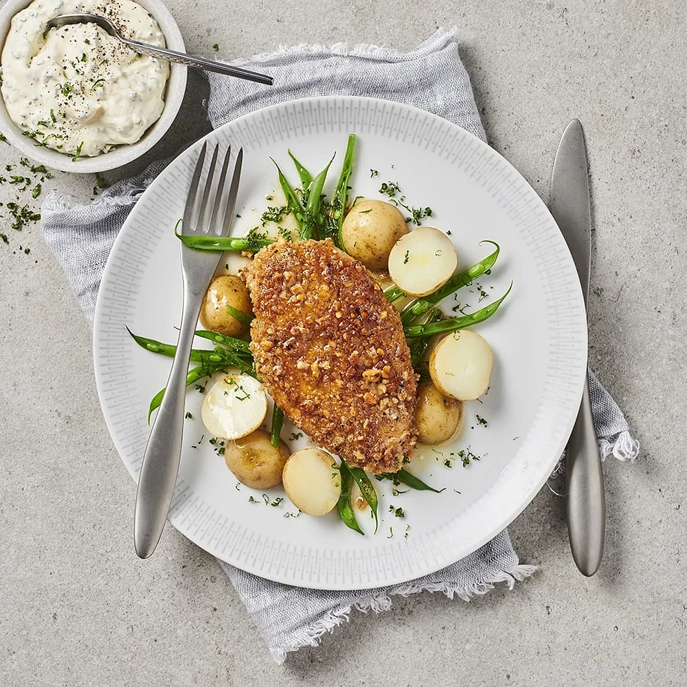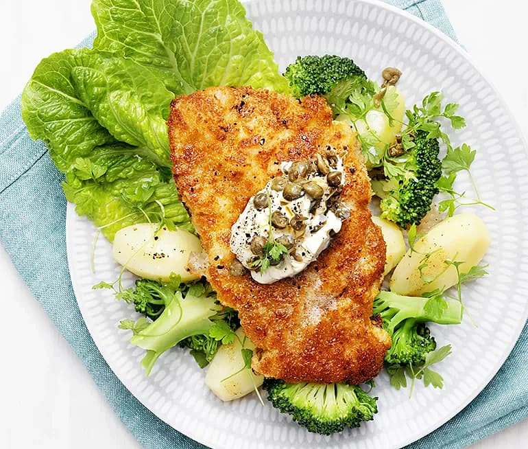 Kycklingschnitzel med rostat grönt & spetskålssallad