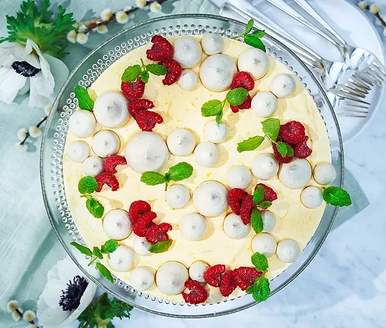 Mangomoussetårta med hallon och lakritsmaränger
