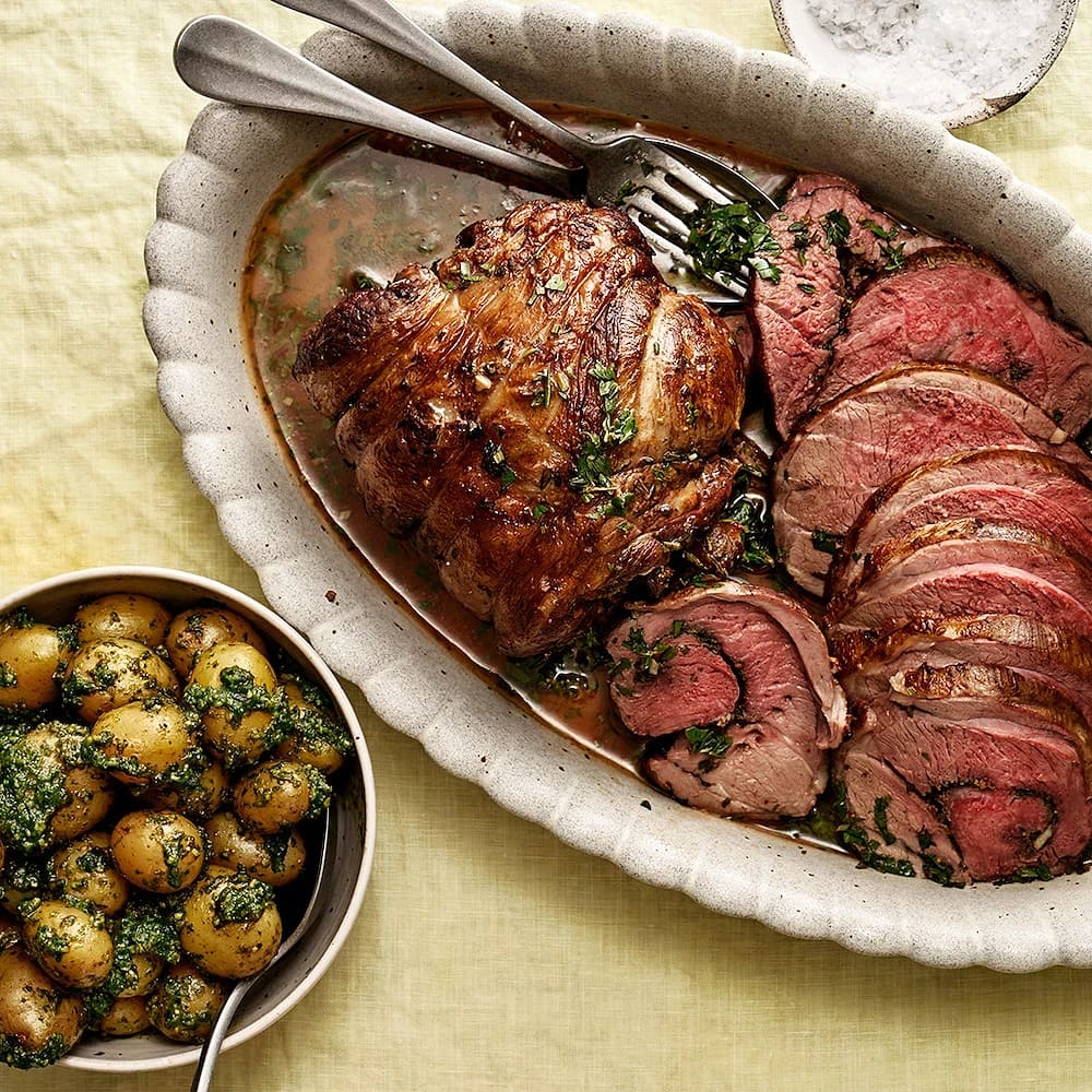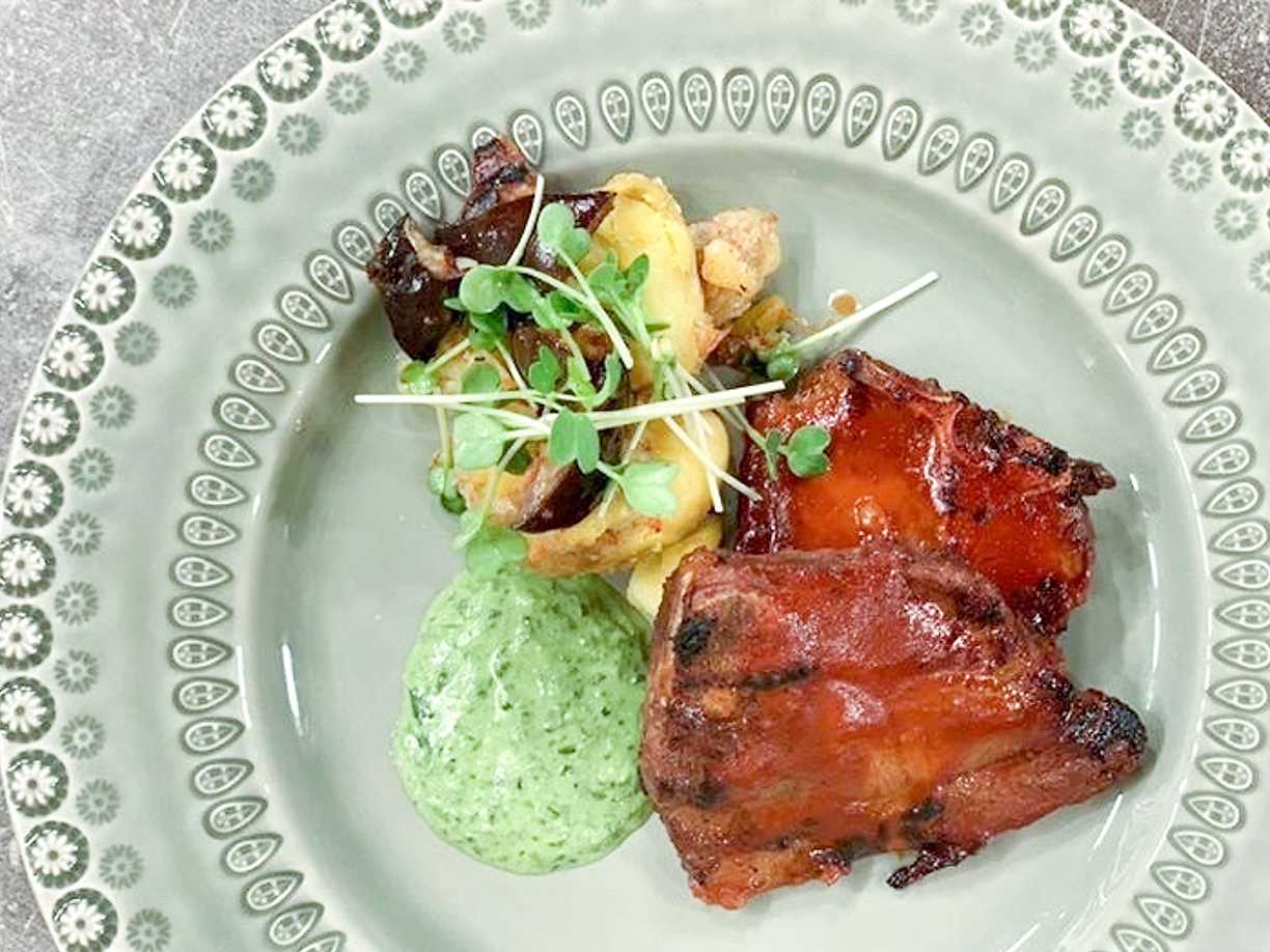 Porchetta på lamm med örtsky och pestopotatis