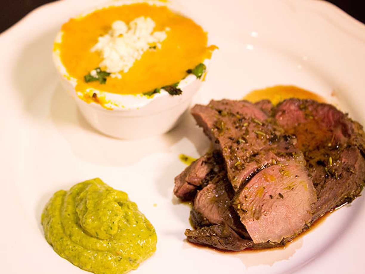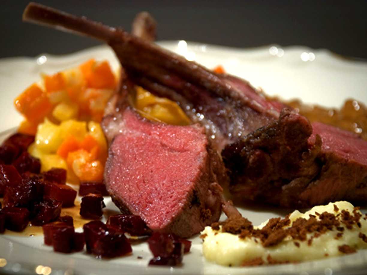 Grillat lamm med rotfruktsgratäng och rödvinssky