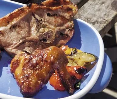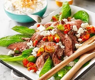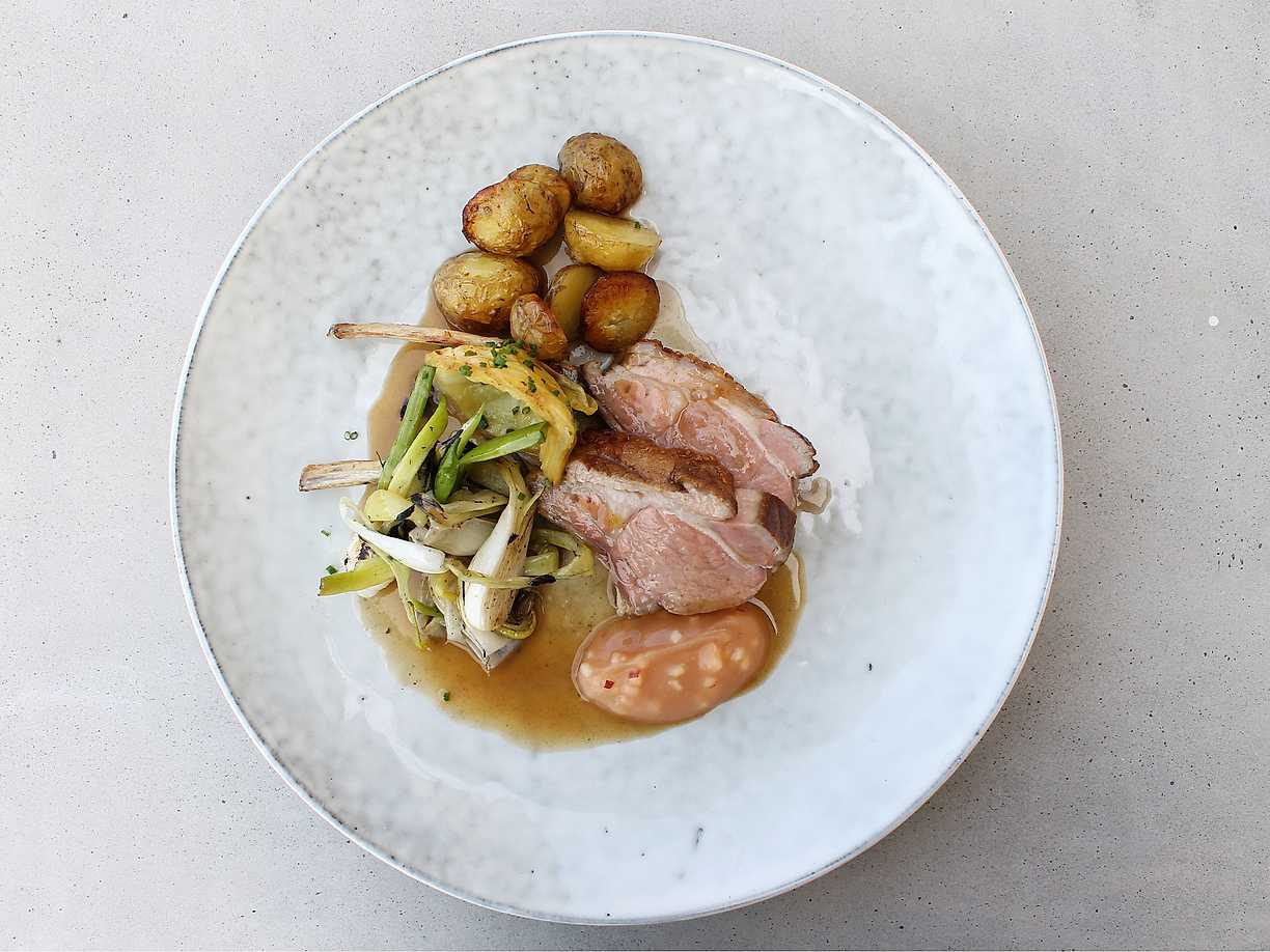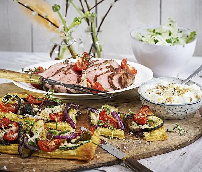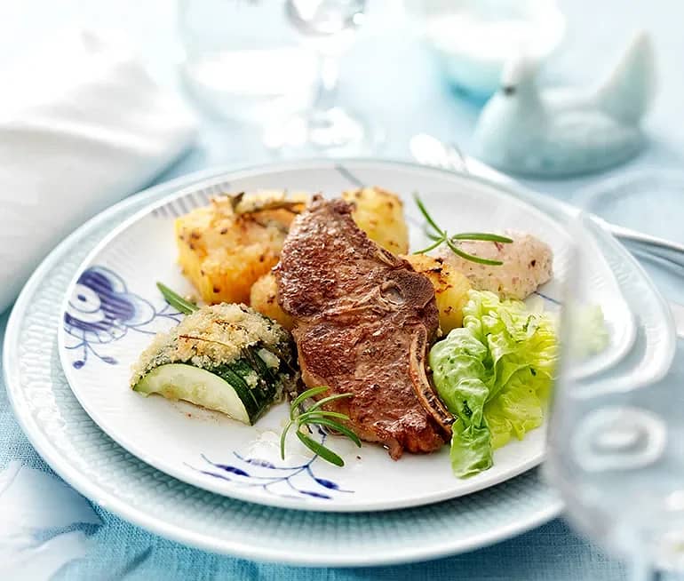 Rosmarinstekt lamm med grönsaksflarn och rostad vitlökssmetana