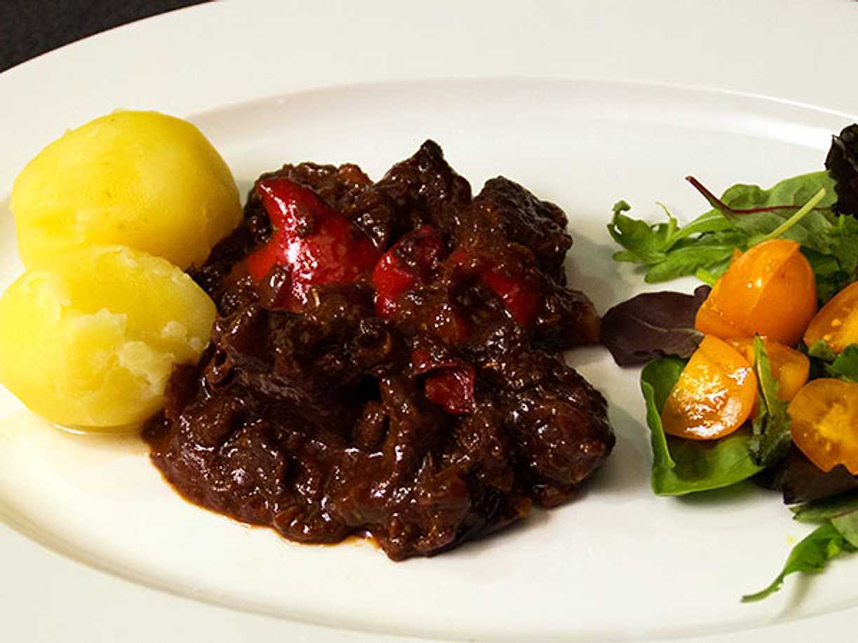 Lamm med hasselbacksgrönsaker och rödlökscrème