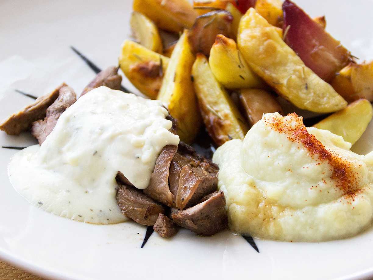 Lammfilé med blomkål- och potatispuré, kantarellpytt och rödvinssås