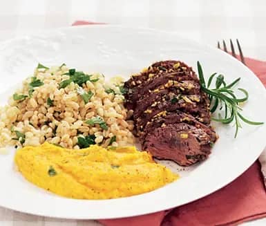 Lammfilé med rosmarinströssel, citronbulgur och morotsbearnaise