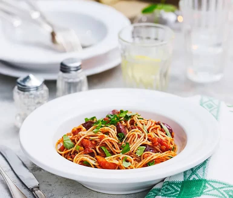 Pasta arrabbiata med lammkorv och het, mustig sås