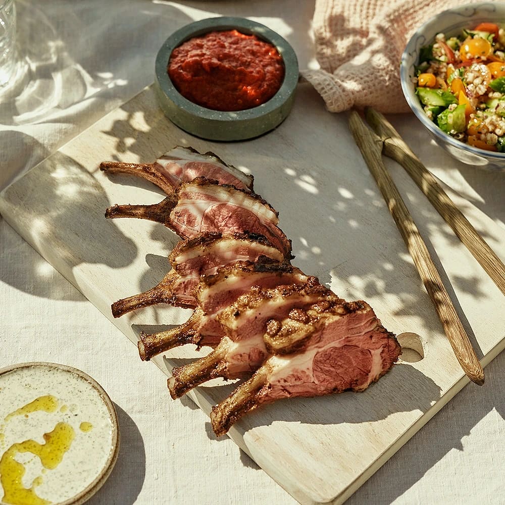 Lammracks med grillade tomater och harissasmör