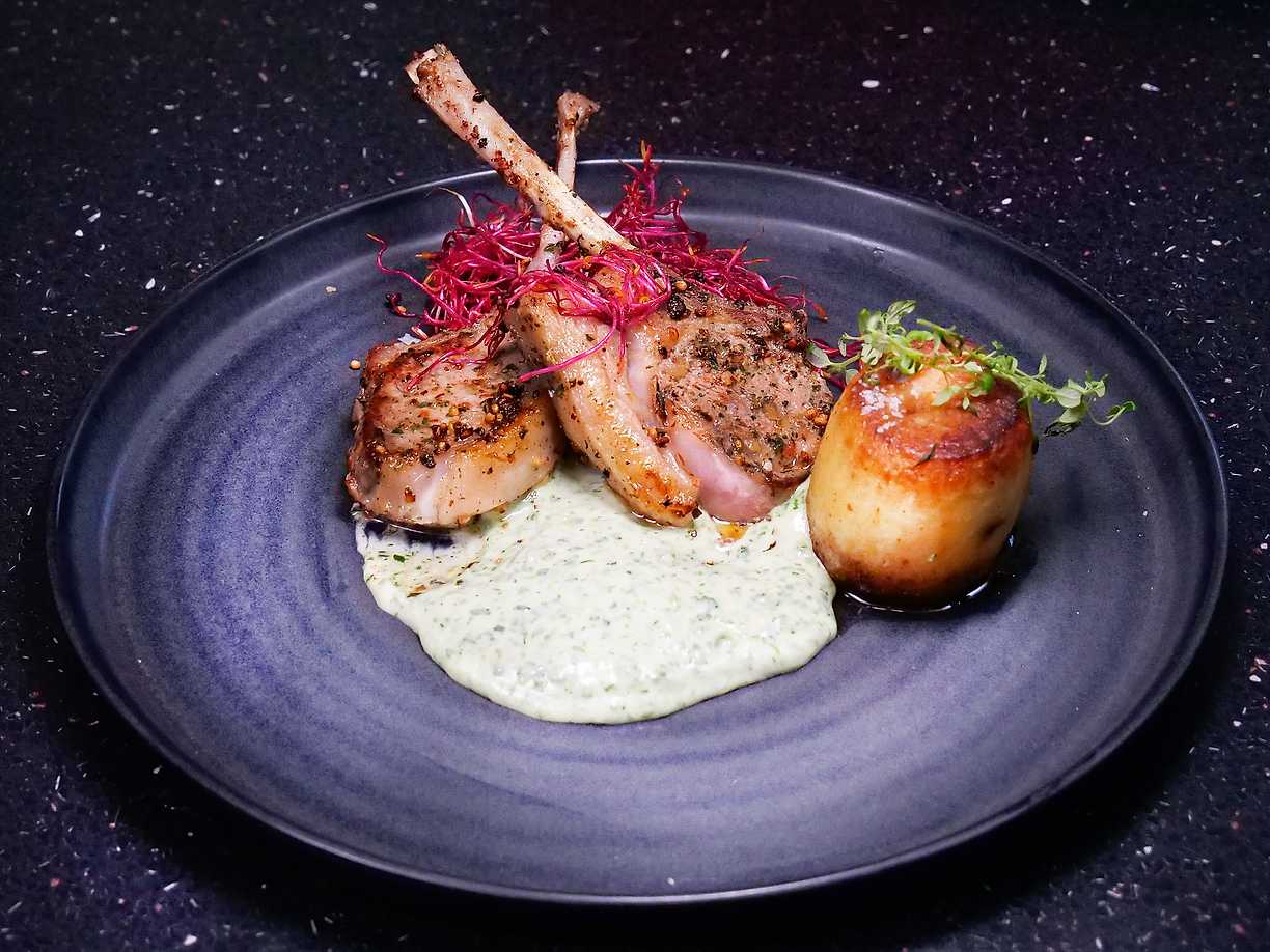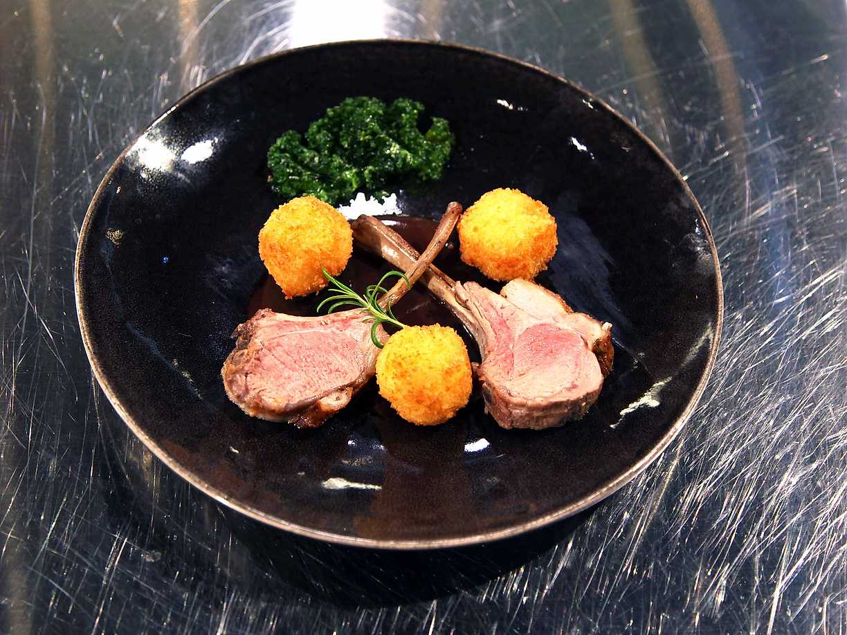 Lammracks med potatiskroketter och rosmarinsky