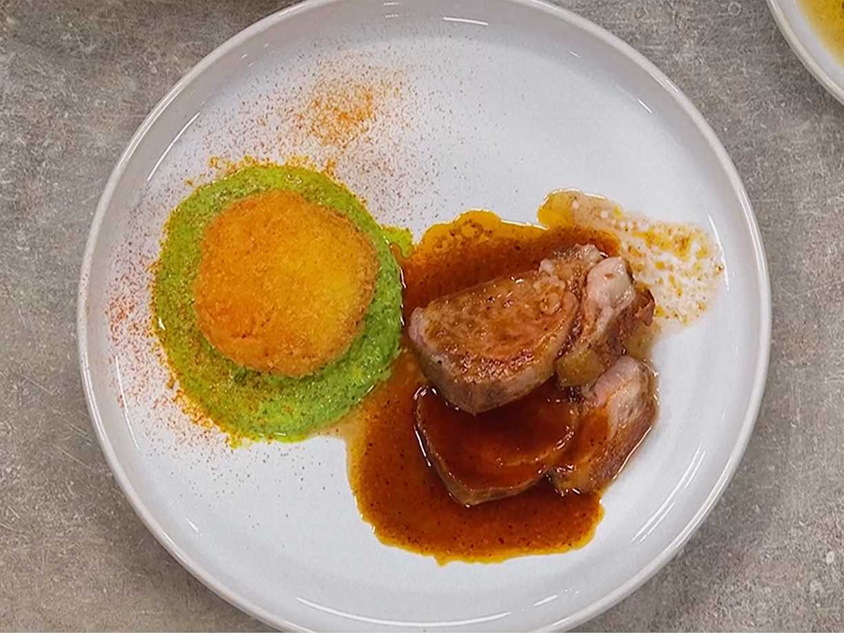 Lammracks med betor, balsamvinägersås och pommes soufflée