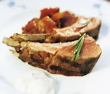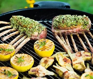 Örtmarinerade lammracks med färskpotatissallad och grillade primörer